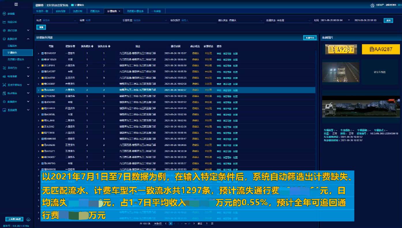 大大降低了稽核工作人員工作強(qiáng)度,提高稽核效率,實(shí)現(xiàn)車輛的全量稽核。按目前稽核數(shù)據(jù)統(tǒng)計(jì),計(jì)費(fèi)缺失、無匹配流水、車型不一致的車輛約占日均車流總量的0.36%,少收、漏收通行費(fèi)約占日均收費(fèi)的0.55%,系統(tǒng)建成后,這部分通行費(fèi)有望實(shí)現(xiàn)全額追回。