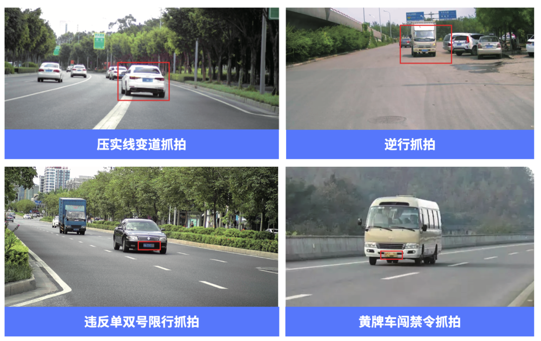 自動(dòng)抓拍通行車(chē)輛壓實(shí)線變道、車(chē)輛逆行、違法單雙號(hào)限行出行、黃牌車(chē)闖禁令的交通違法行為,生成符合要求的違法證據(jù),并實(shí)時(shí)上傳到公安集指平臺(tái)。