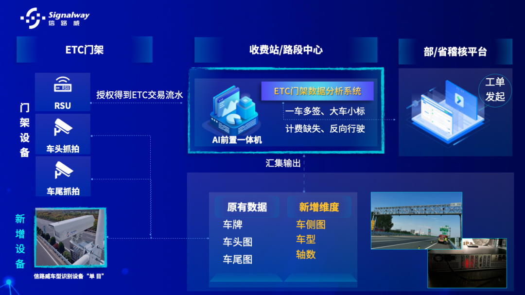 天昂公司通過在京哈高速公路ETC門架部署信路威AI車型識別設(shè)備“單目”,識別車輛的車側(cè)圖、車型、軸型、輪/軸數(shù)等多維特征數(shù)據(jù),并把數(shù)據(jù)上傳至ETC門架數(shù)據(jù)分析終端,經(jīng)過數(shù)據(jù)融合分析比對,有效識別“大車小標”“貨車客標”“反向行駛”“一車多簽”等逃費行為,實現(xiàn)“特殊車輛管理”“異常數(shù)據(jù)分析”“流量分析’等功能,對通行車輛進行全場景的監(jiān)控和管理,為收費稽核提供科技的數(shù)據(jù)支撐。