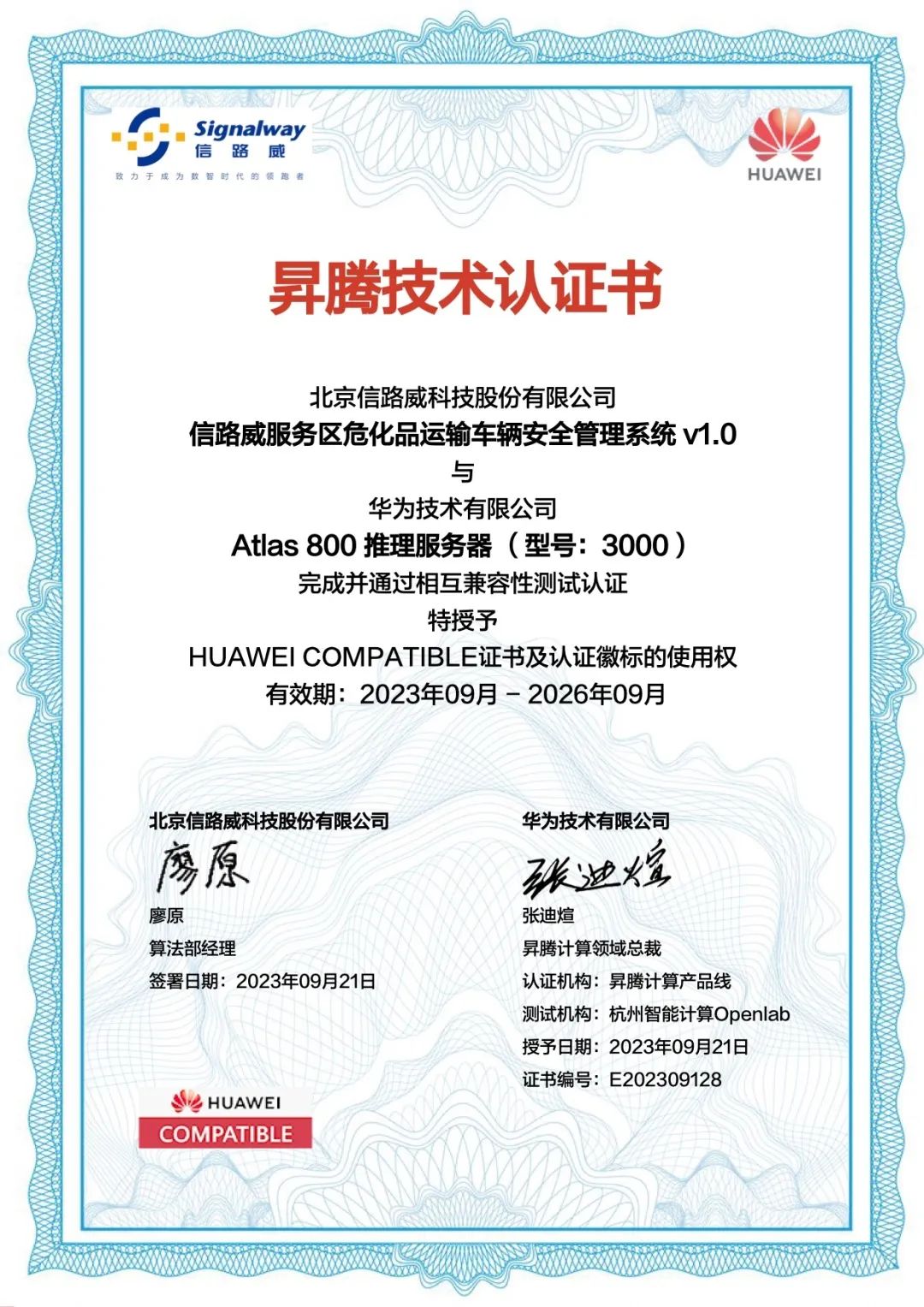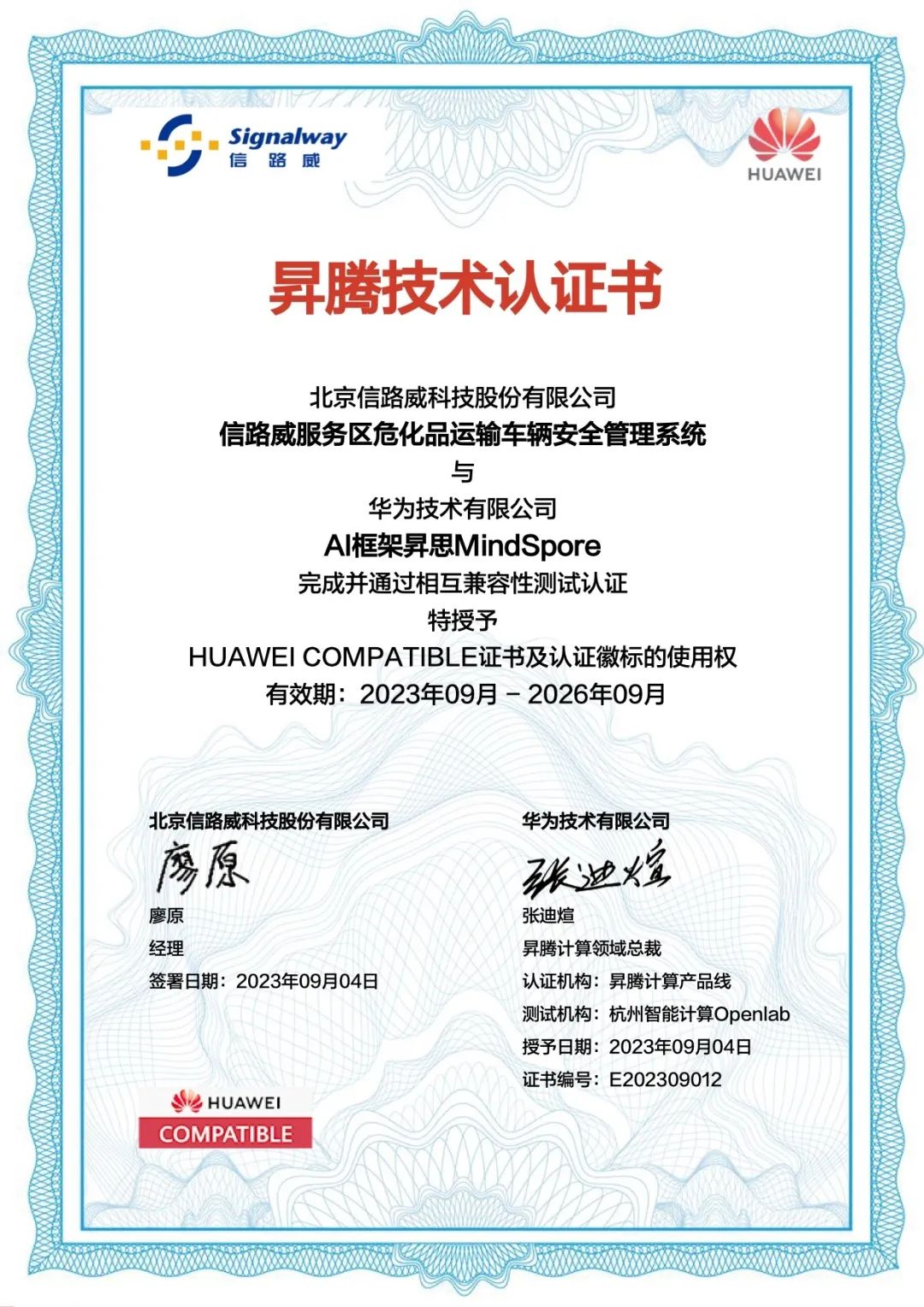 近日,信路威服務(wù)區(qū)?;愤\(yùn)輸車輛安全管理系統(tǒng)與華為AI框架昇思MindSpore、Atlas 800推理服務(wù)器(型號3000)、Atlas 800訓(xùn)練服務(wù)器(型號9000)的相互兼容性測試,可充分滿足相關(guān)行業(yè)安全性、可靠性、穩(wěn)定性的應(yīng)用需求,信路威獲得了HUAWEI COMPATIBLE 證書及認(rèn)證徽標(biāo)的使用權(quán)。