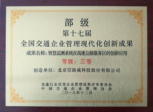 近日,由中國交通企業(yè)管理協(xié)會主辦的“2018年全國交通企業(yè)管理創(chuàng)新年會”在山東濟(jì)南召開, 大會表彰了第十七屆全國交通企業(yè)管理現(xiàn)代化創(chuàng)新成果,信路威《智慧監(jiān)測系統(tǒng)在高速公路服務(wù)區(qū)的創(chuàng)新應(yīng)用》課題榮獲2018年度全國交通企業(yè)管理現(xiàn)代化創(chuàng)新成果三等獎(jiǎng)。