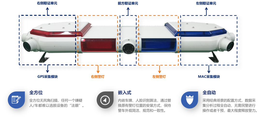 該系統(tǒng)共有七個(gè)抓拍攝像頭,在近乎360度范圍內(nèi)抓拍機(jī)動車違法停車、逆向行駛、不遵守信號燈等交通違法行為,并具備自動識別、采集違法車輛號牌及現(xiàn)場照片、音頻的功能,及時(shí)固定交通違法行為證據(jù)。
