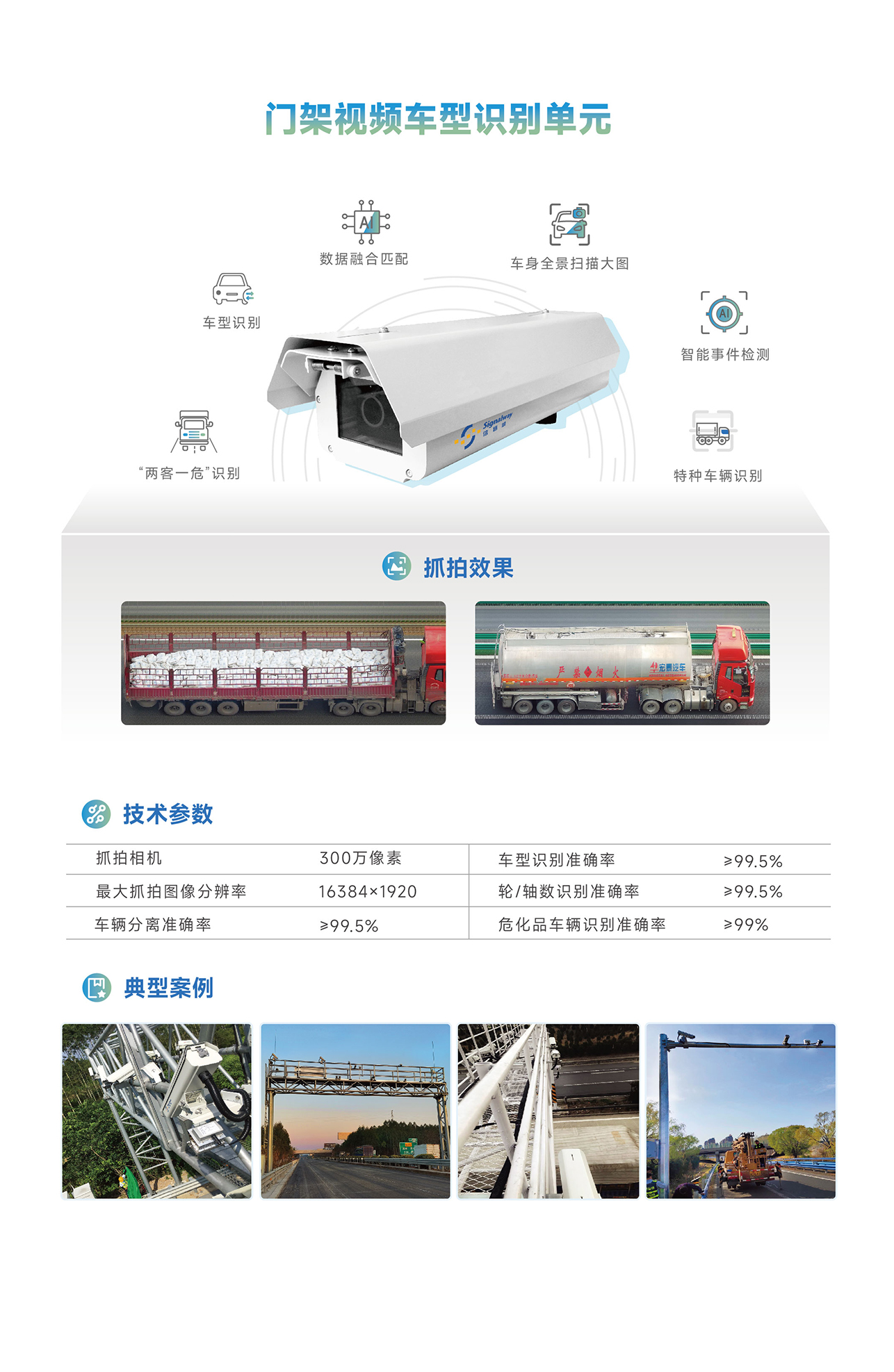 公司自主研發(fā)的門架式車型識別系統(tǒng),集圖像采集、車輛檢測、車型識別、?;奋囕v識別、冷鏈運輸車輛識別于一體,提供車型識別結(jié)果、車輛車身側(cè)面高清全景大圖和車型結(jié)構(gòu)化信息,配合車牌識別系統(tǒng)使用,提供車輛多維特征信息,為收費提供依據(jù),有效遏制車輛逃費問題,主要應(yīng)用于高速公路ETC門架系統(tǒng)、國省道門架系統(tǒng)等。