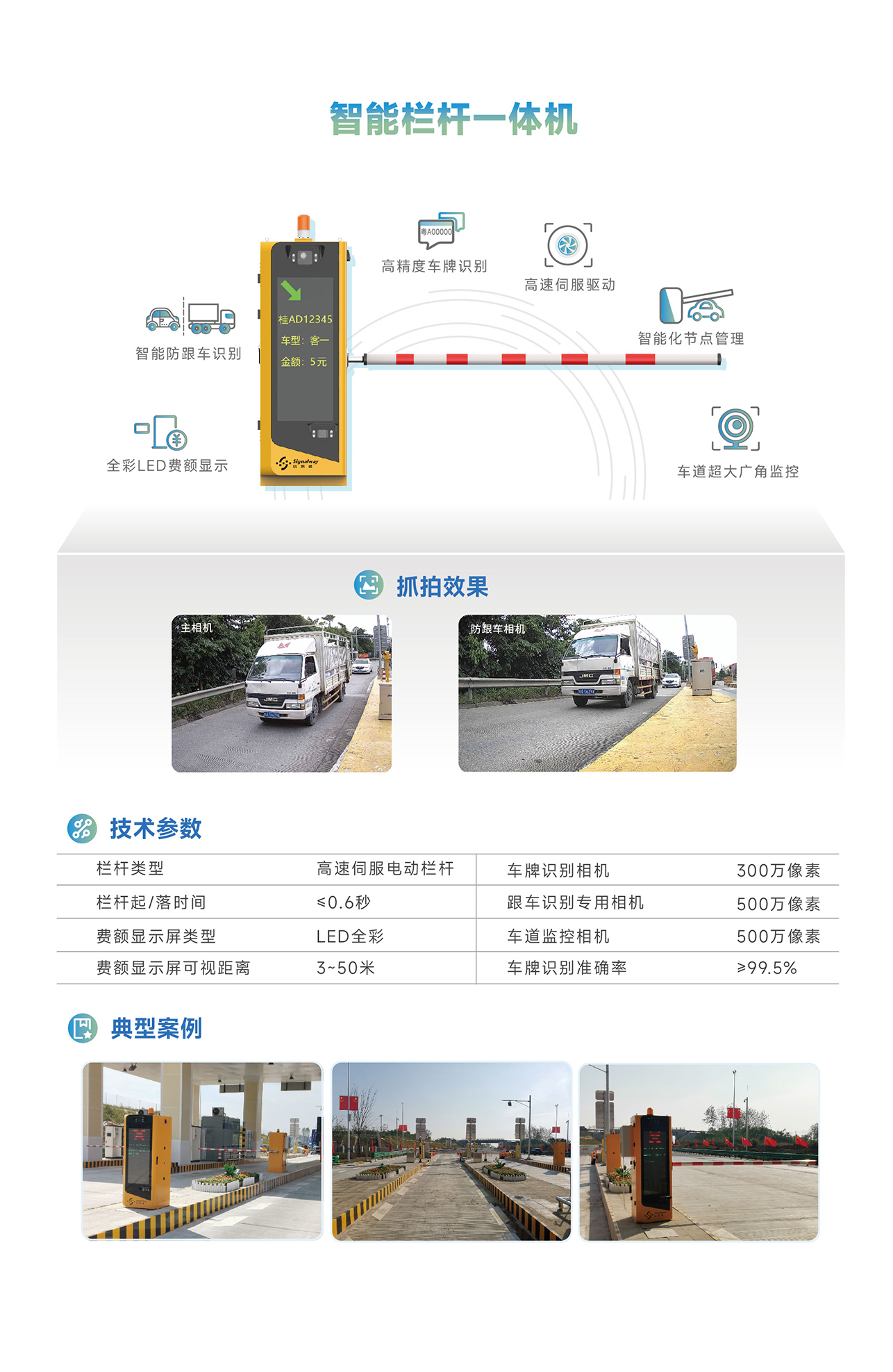 公司自主研發(fā)的智能欄桿一體機,主要由高速欄桿機、費額顯示屏、車牌識別相機、防跟車相機、車道監(jiān)控相機及多個補光燈組成,集圖像采集、車輛檢測、車道視頻監(jiān)控、車牌識別、費額顯示、高速欄桿于一體,集成化減少了對收費島的占地要求,使得車道機電系統(tǒng)維護(hù)更便捷,適用于高速公路收費站收費車道。